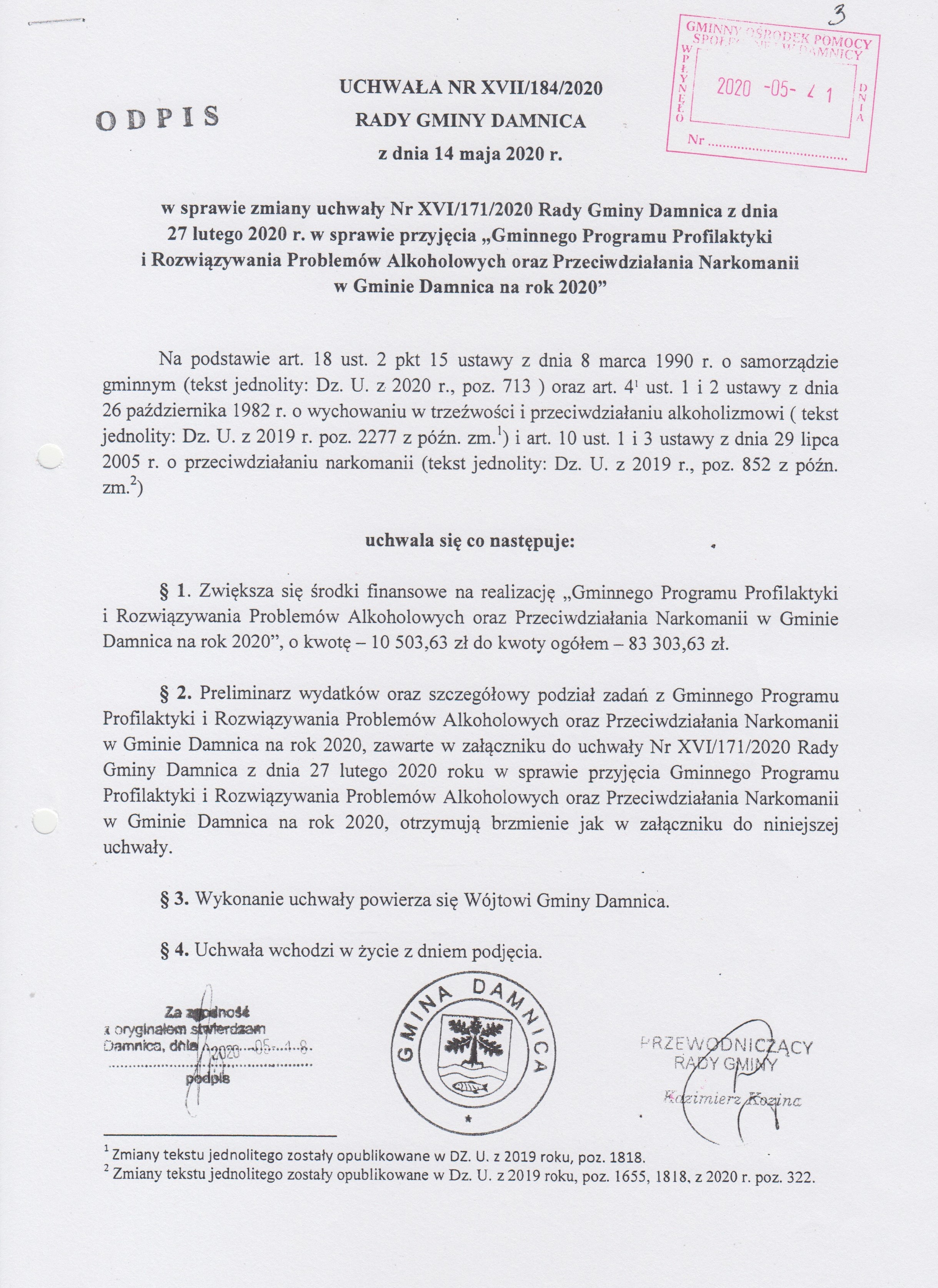 Zmiany do Gminnego Programu Profilaktyki i Rozwiązywania Problemów Alkoholowych oraz Przeciwziałania Narkomanii w Gminie Damnica na rok 2020
